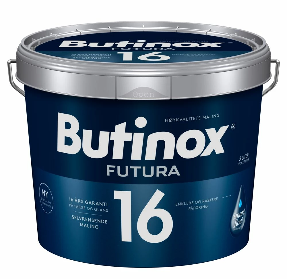 Butinox Futura 16 er bygget på en helt ny generasjon akrylteknologi og kan dermed gi hele 16 års garanti på farge og glans. Eksteriørmalingen er testet under ekstreme klimatiske forhold, både i solrike Florida og i Norge. Langtidstester viser at Butinox Futura 16 er imponerende 55% bedre på farge og glans enn tradisjonell maling.