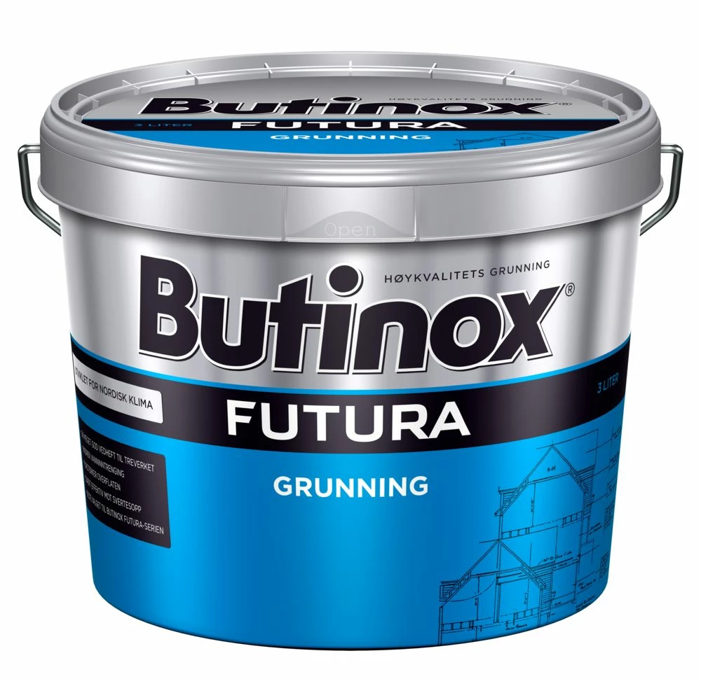 Butinox Futura grunning er en grunning for alt utvendig treverk. Grunningen kan benyttes på både høvlede og uhøvlede flater, samt trykkimpregnert trevirke. Grunningen inneholder aktive midler mot svertesopp. Den bør snarest mulig videre behandles med et toppstrøk, men kan stå i opptil 1 måned før toppstrøket påføres. Det er viktig at nytt, utvendig treverk alltid settes inn med grunning som første strøk. Det anbefales viderebehandling innen 3 uker med Butinox Futura Selvrensende, Butinox Futura Soft Look, Butinox Futura Maling eller Butinox Futura Dekkbeis.