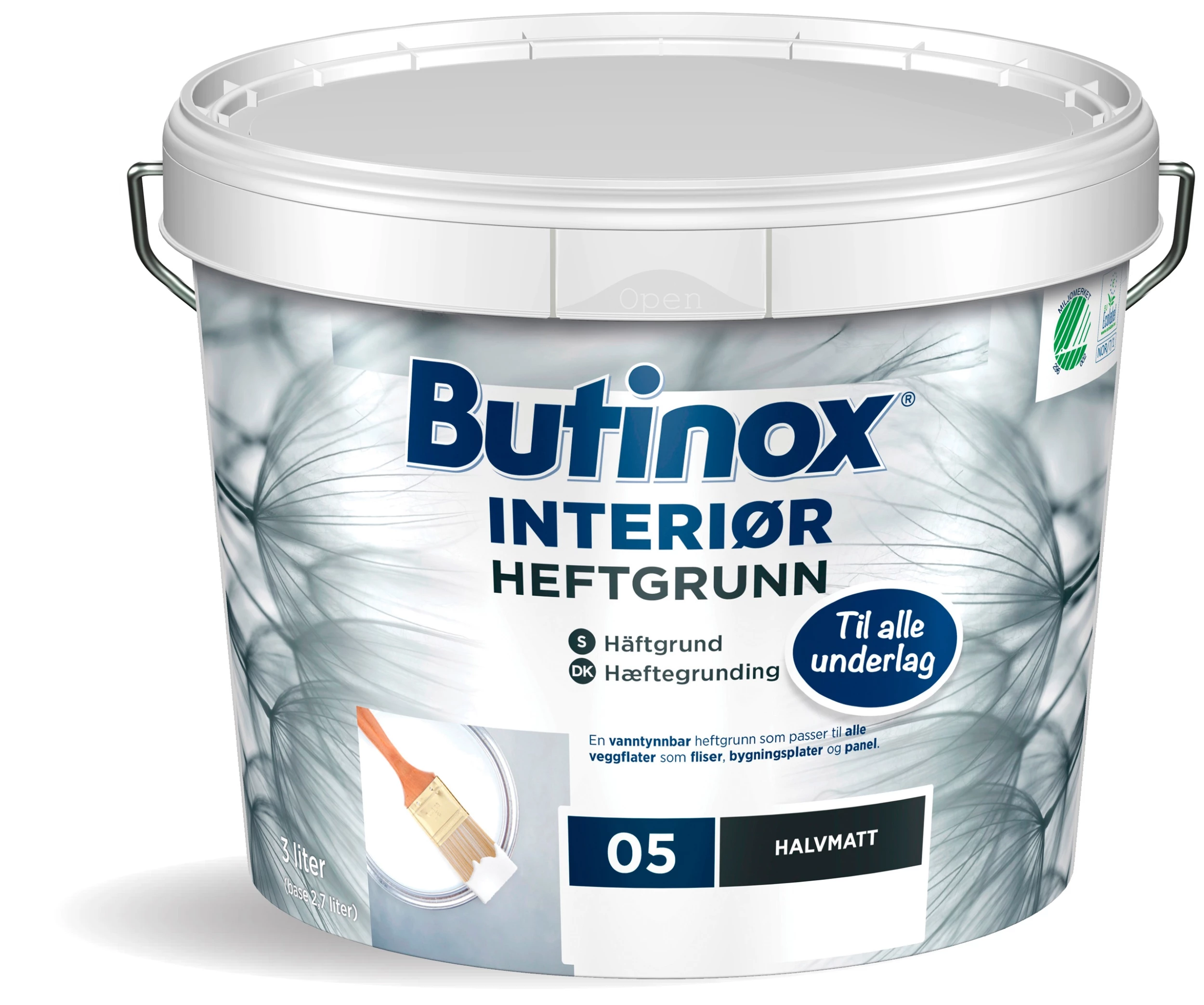 Butinox Interiør heftgrunning er ment for innendørs bruk og har god vedheft til de fleste underlag som tidligere malte flater, blanke flater, panel, tapet, bygningsplater, harde plaster og keramiske fliser i tørre rom. Det anbefales å gjøre et prøvestrøk på fliser og plast for å kontrollere hefteevnen. Nytt panel bør først behandles med kvistlakk. Forbruk: 8 – 10 m2/l. pr. strøk. Kommer i spann på flere størrelser.