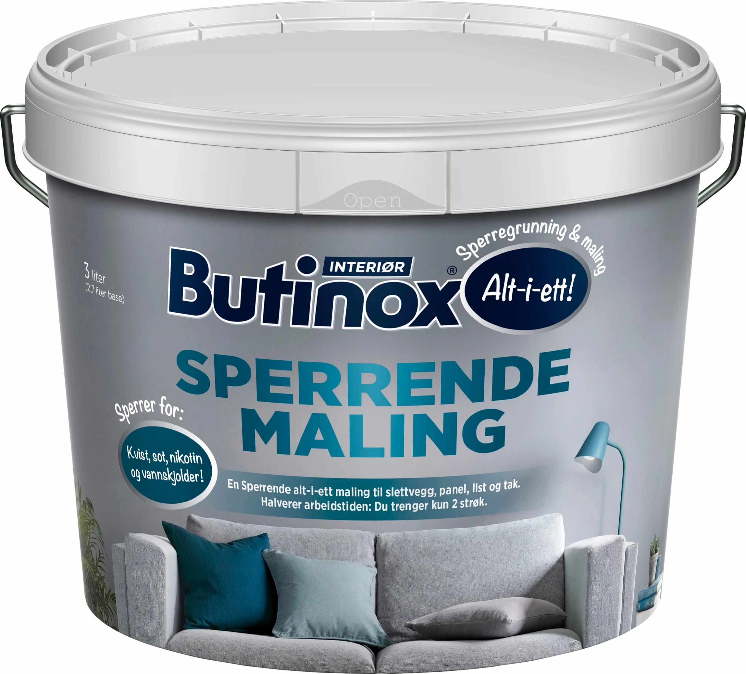 Butinox Interiør Sperrende maling er en sperrende alt-i-ett maling til selttvegg, panel, list og tak. Produktet er en grunning og toppstøk i ett og samme spann. Med dette produktet halverer du arbeidstiden da du kun trenger 2 strøk. Malingen sperrer for kvist, sot, nikotin og vannskiolder. Påføring med rule og eller pensel. Anbefalt forbruk pr. strøk: 8-10 m²/liter.