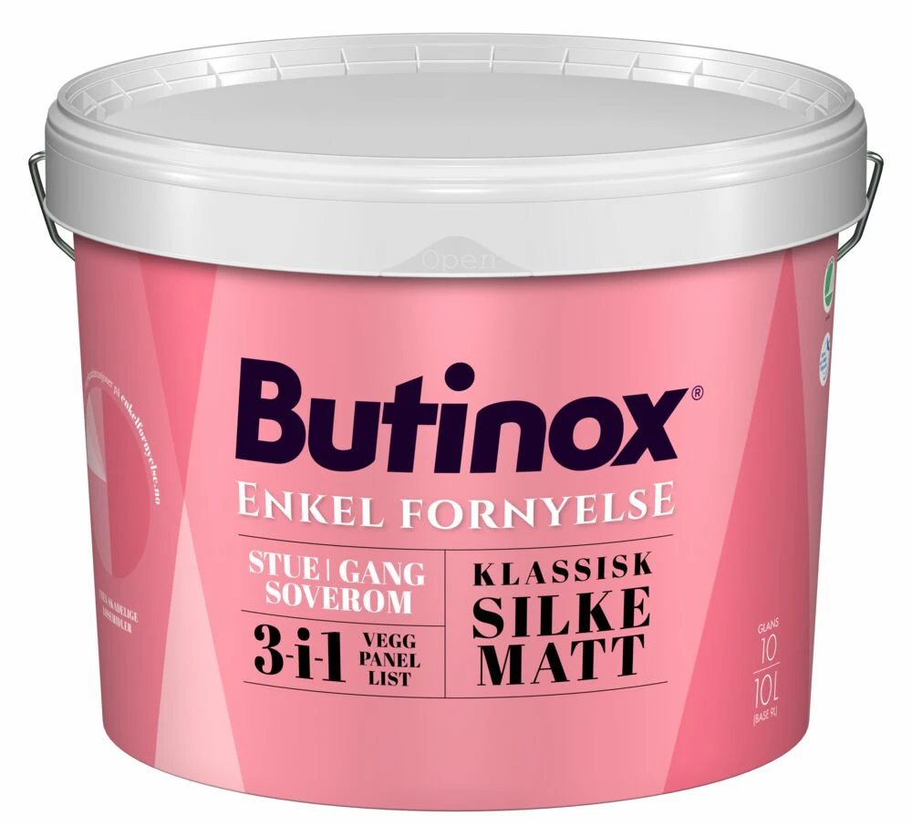Butinox Klassisk Silkematt er en kombinasjonsmaling som passer til stuen, gangen og soverommet og kan brukes på vegg, panel og list 3-i-1.