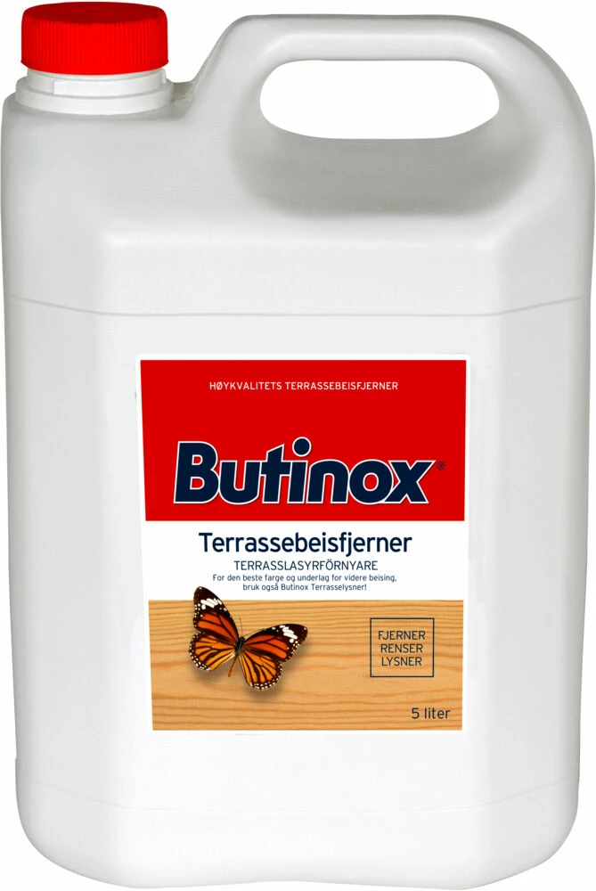 Butinox Terrassebeisfjerner er en effektiv fjerning av gammel terrassebeis/olje. Den både fjerner gammel beis, renser dypt og lysner treverket.