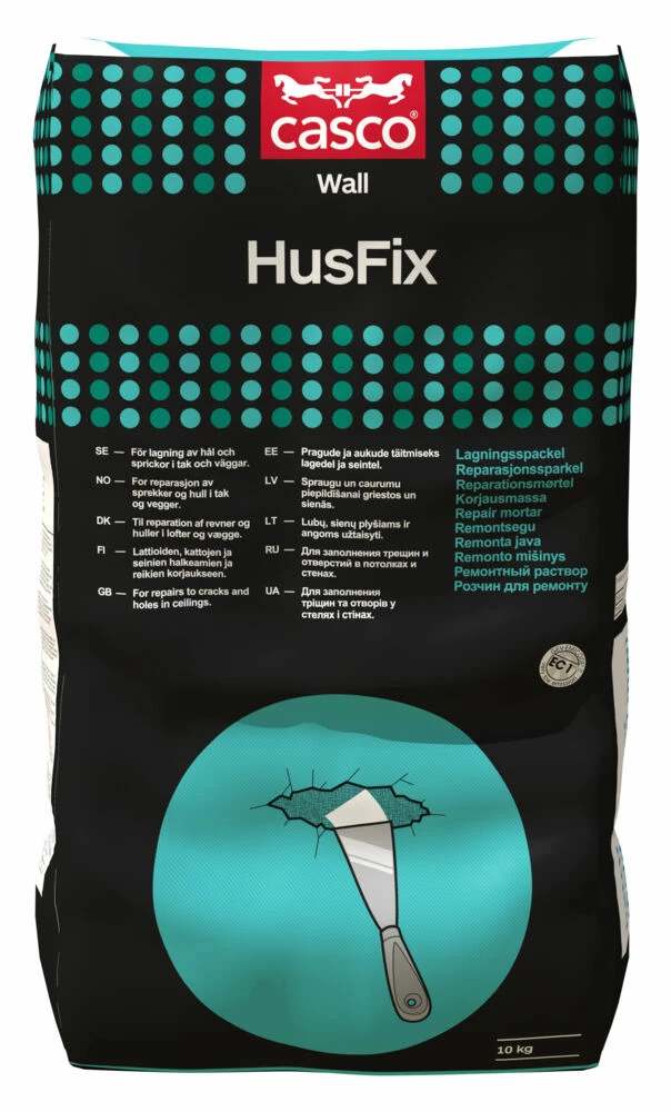 Casco Husfix veggsparkel 10 kg er en pulverbasert sparkelmasse. Sparkelmassen er beregnet for vegger, tak og grunnmurer. Den kan og brukes på annet. Kan også benyttes som våtromssparkel. Er like god til bruk ute som inne. Lett å slipe.