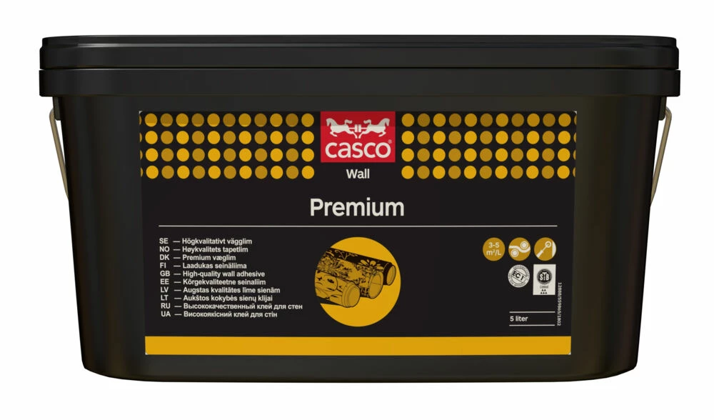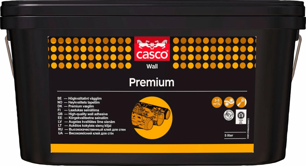 Casco Premium vegglim har god heft og er lett og smidig å påføre. Kan brukes til alle tapeter i tørre rom og er overmalbar etter 8-12 timer, avhengig av tapet og temperatur. Forbruk 3-5 m² pr. liter.