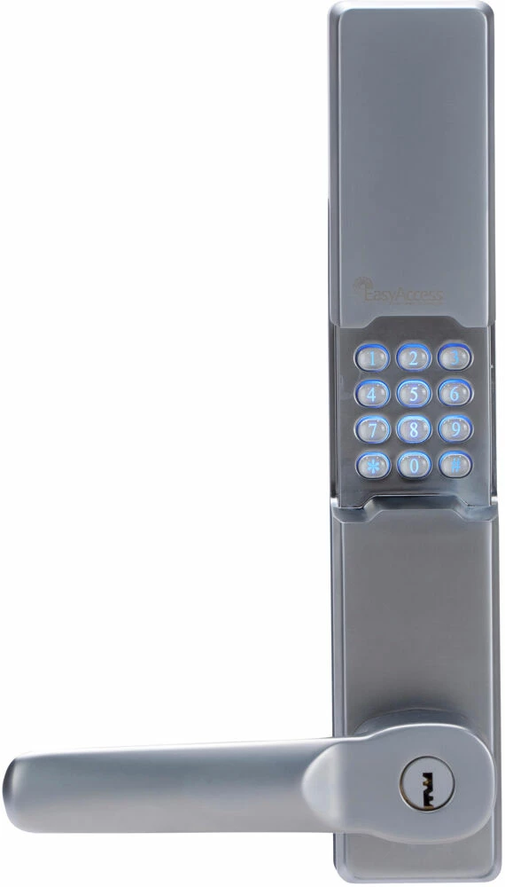 Easy Access EasyCode V2 kodelås har automatisk lys i tastatur når skyvedeksel åpnes, og store knapper. Lys indikasjon på innedelen som viser om døren er låst eller ulåst fra yttersiden.