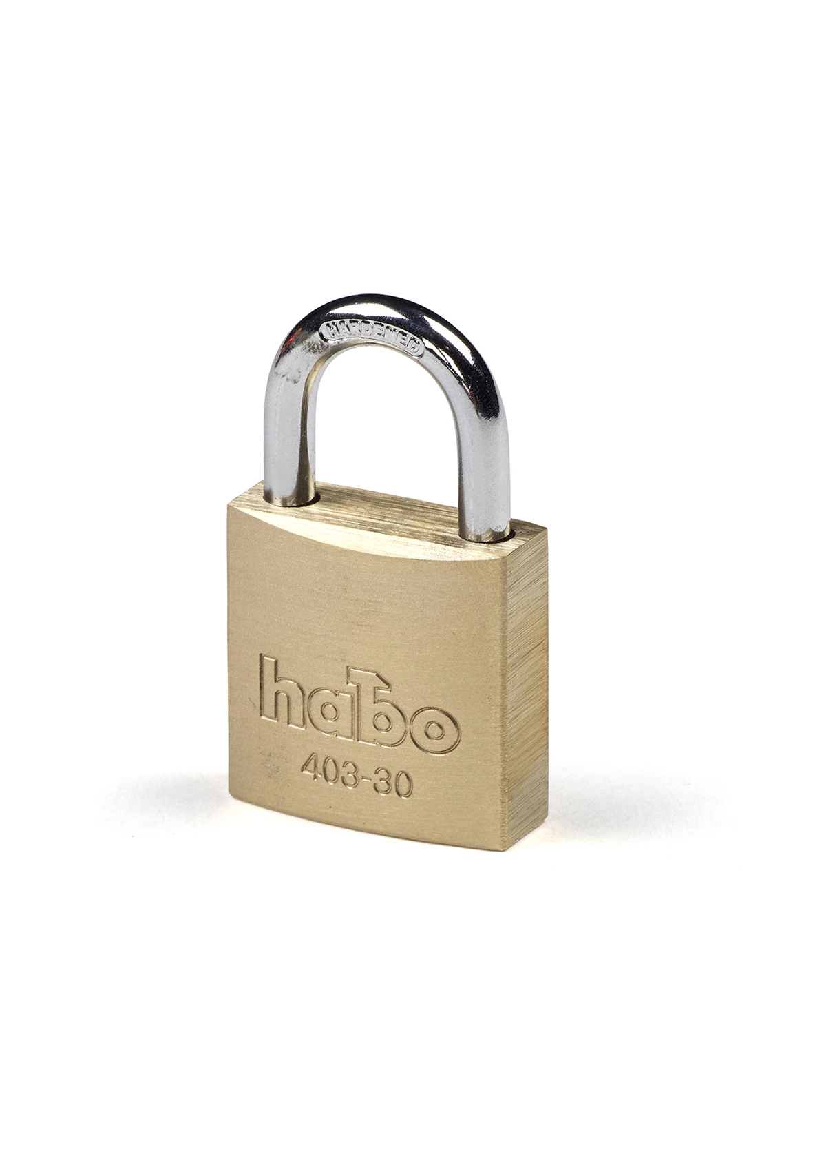 Habo 403-30 hengelås av massiv messing. En solid hengelås med mange bruksområder. Egnet for bruk både inne- og utendørs. Låsen har Ø5 mm dobbelboltet bøyle av herdet stål. Leveres med 2 stk. nøkler.