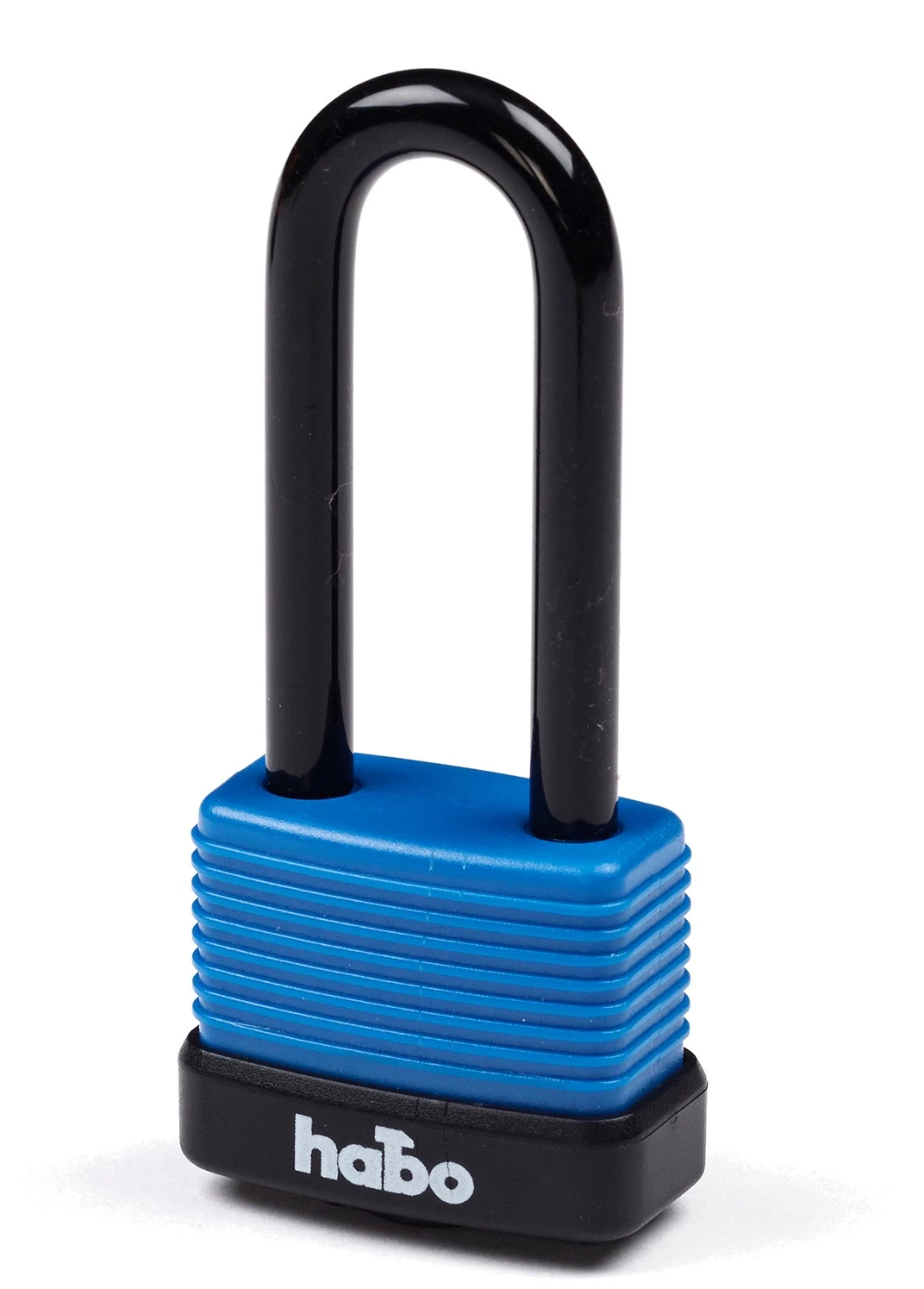 Hengelås av aluminium med værbeskyttende plastoverdrag og nøkkelhullsbeskyttelse. Låsen har dobbelboltet høy bøyle av rustfritt stål, Ø8 mm. Leveres med 2 stk. nøkler pr. lås. Egnet for bruk både inn- og utendørs.
