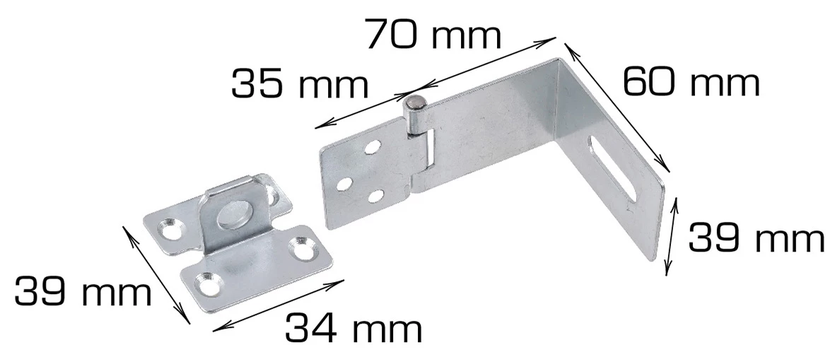 Låsebeslag – 90 grader Mål: L60 x B39 mm. Passer til hengelås inntil 10 mm. Inkl. skruer. Materiale: Elforsinket