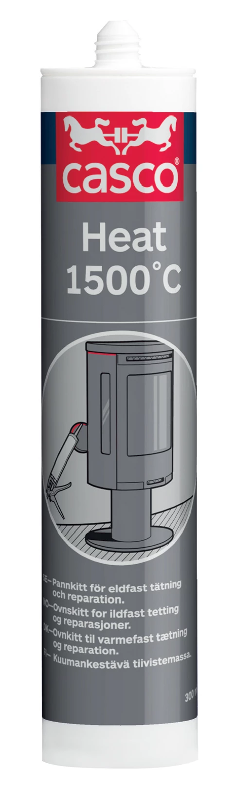 Casco Heat 1500°C ildfast fugemasse brukes til å reparere og fuge i peiser, kaminer, fyrkjeler, piperog mye mer. Fugemassen fungerer også utmerket til reparasjon av eksosanlegg på biler og motorsykler. Fester mot metall, tegl og sement.