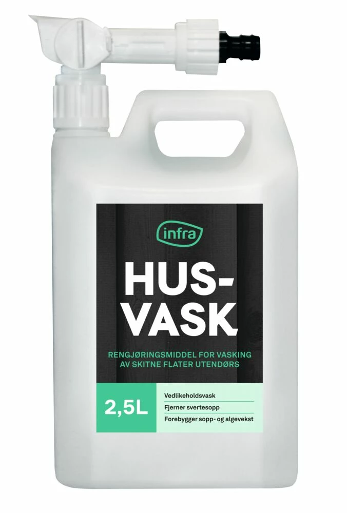 Infra husvask er et effektivt vaskemiddel basert på biologisk nedbrytbare råvarer for årlig vask av hus som fjerner forurensing og svertesopp på husvegger. Middelet kan også benyttes til vask av biler, båter, maskiner og containere, eller i industrien, på verksteder, landbruk og offentlig bad. Husvasken blandes 1:30, dvs 1 liter Infra Husvask til 30 liter vann og påføres huset med lavtrykksprøyte/pumpesprøyte, eventuelt høytrykksprøyte. Det anbefalte forbuket er 1 liter vaskeløsning til ca. 15 m². Minimum påføringstemperatur er 0 C, best virkning er ved 20 C.