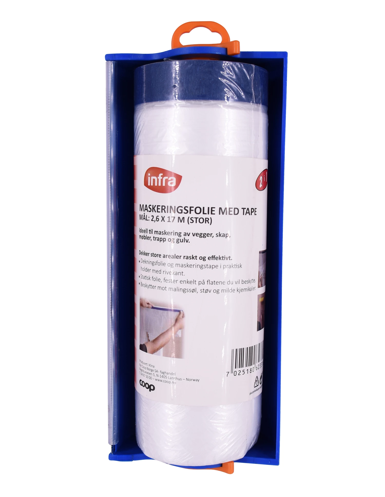 Maskeringsfolie med tape dekker store arealer raskt og effektivt. Ideell til maskering av vegger, skap, møbler, trapp og gulv. Beskytter mot malingssøl, støv og milde kjemikalier. Dekningsfolie og maskeringstape i praktisk holder med rivekant. Statis, fester enkelt på flatene man vil beskytte. Mål: 2,6×17 m.