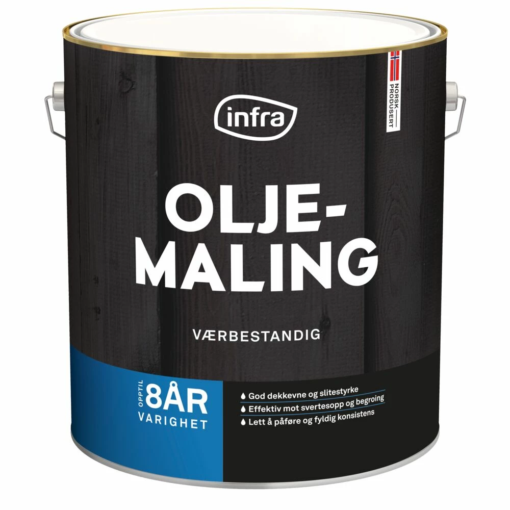 Infra oljemaling er en meget værbestandig oljemaling for utvendig treverk. God dekkevne og lange vedlikeholdsintervaller. Oljemalingen inneholder filmkonserverende middel som motvirker vekst av svertesopp og alger på overflaten. Malingen er lett å påføre og har en fyldig konsistens. Anbefales på nytt grunnet treverk, samt på tidligere beiset, dekkbeiset eller malt underlag utendørs. Oljemalingen kan også benyttes som toppstrøk på stål og andre metaller. Ubehandlet tre må grunnes først. Ved tidligere malt/beiset tre må det vaskes med kraftvask først. Inneholder lysstabilisator. Anbefalt forbruk pr. strøk: 8-10 m²/liter.