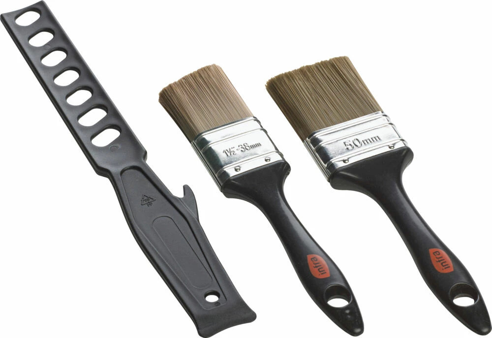 Infra penselsett interiør og vindu. Penselsett for karmer og lister. Består av flat pensel 50 mm, skrå pensel 38 mm og rørepinne.