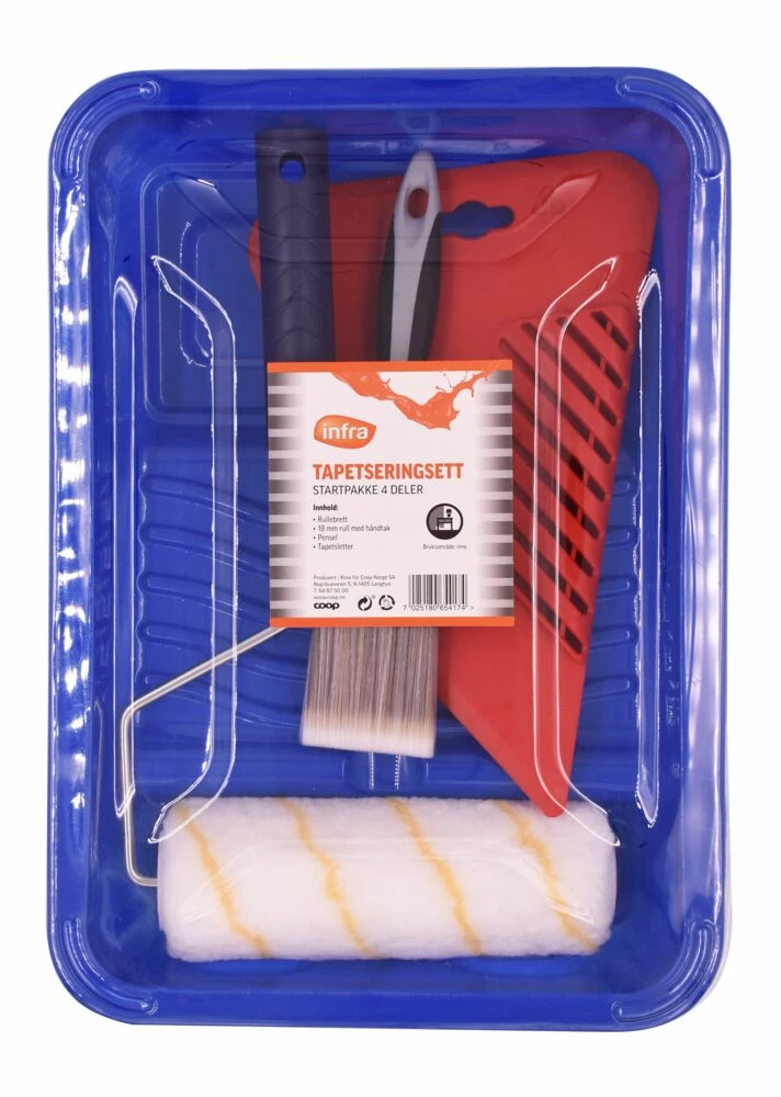 Infra tapetseringsett med 4 deler. Inneholder rullebrett, 50 mm pensel, 18 mm rull med håndtak og tapetsletter. Innendørsbruk.