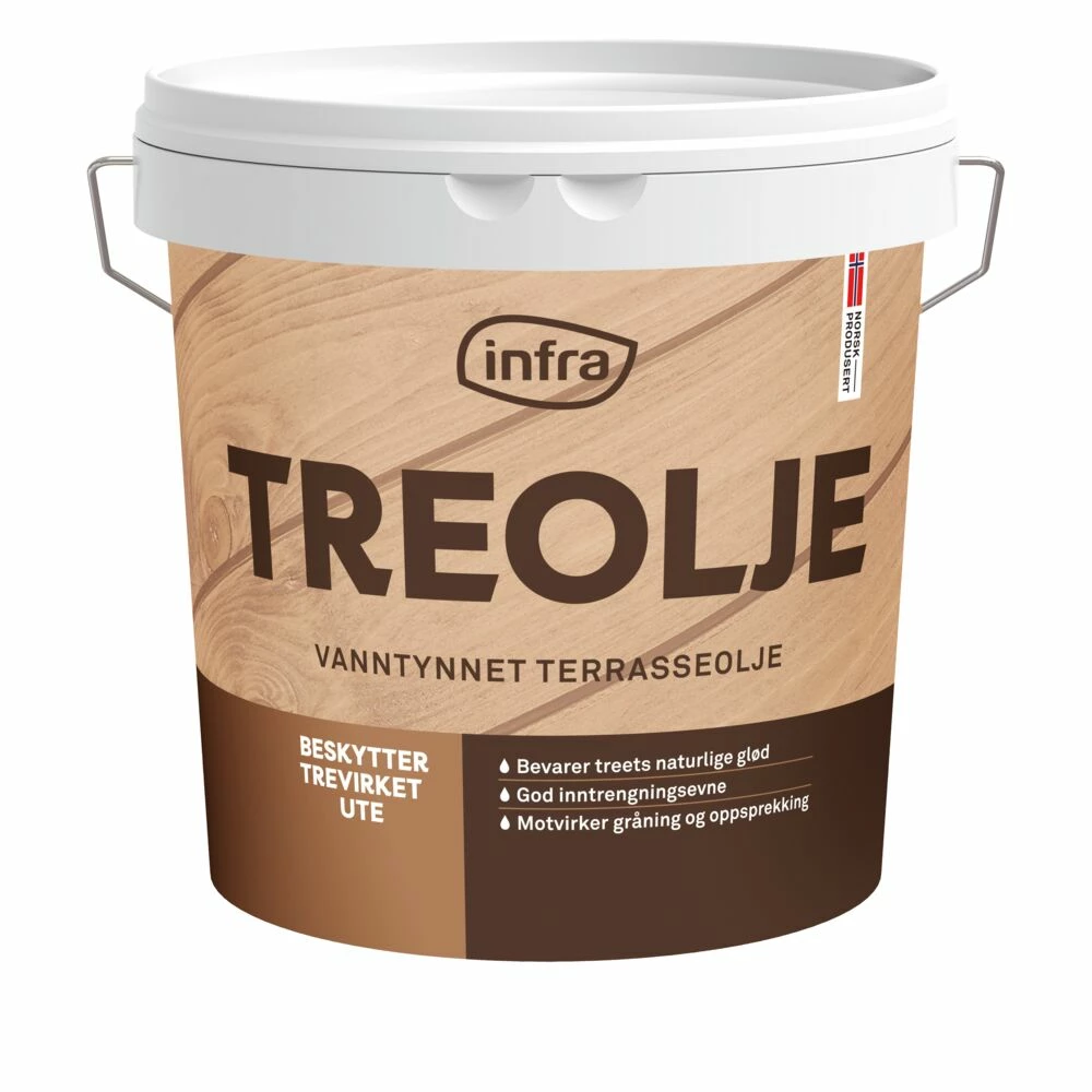 Infra treolje motvirker oppsprekking og gråning av treverket. Treoljen gir god beskyttelse mot svertesopp. For utvendig bruk på impregnert treverk. Anbefalt forbruk pr. strøk: 8-10 m²/liter.