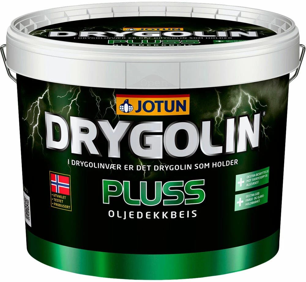 Jotun Drygolin Pluss oljedekkbeis er en meget værbestandig og moderne oljedekkbeis med vannavvisende teknologi og ekstra god beskyttelse og holdbarhet. Oljedekkbeisen fremhever treets naturlige struktur, den holder farge og glans lengre og er ekstra effektiv mot svertesopp og alger. Meget gode påføringsegenskaper gjør den lett å male med og den spruter og drypper lite. Gode heftegenskaper. Ubehandlet tre må grunnes først, ved tidligere malt/beiset tre må det vaskes først med kraftvask. Lange vedlikeholdsintervaller. Glansgrad 40-60 halvblank. Anbefalt forbruk pr. strøk: 10-15 m²/liter (glatte underlag) og 7-10 m²/liter (ujevne underlag).