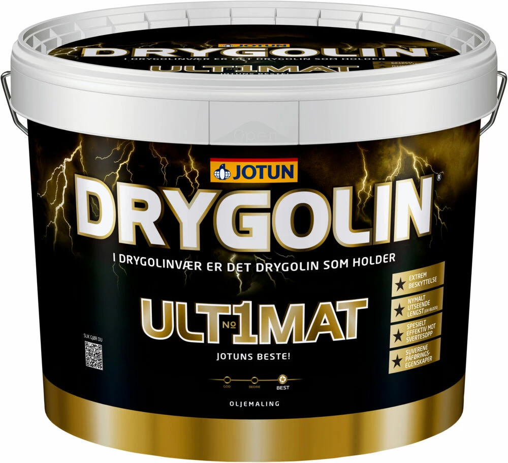 Jotun Drygolin Ultimat er en utendørs moderne oljemaling med spesielt lang holdbarhet. Malingen har svært god beskyttelse mot det tøffe og varierte norske været, og har langvarig farge- og glansholdbarhet. Hybridteknologi som kombinerer de beskyttende egenskapene til oljemaling, og farge og glansegenskapene til akrylmaling. Høy glans og UV-blokk gjør at huset ser nymalt ut lengre. Inneholder filmkonserverende middel som motvirker vekst av svertesopper og alger på treoverflaten. Malingen har meget gode påføringsegenskaper og tørker raskt –.2 strøk på en dag.