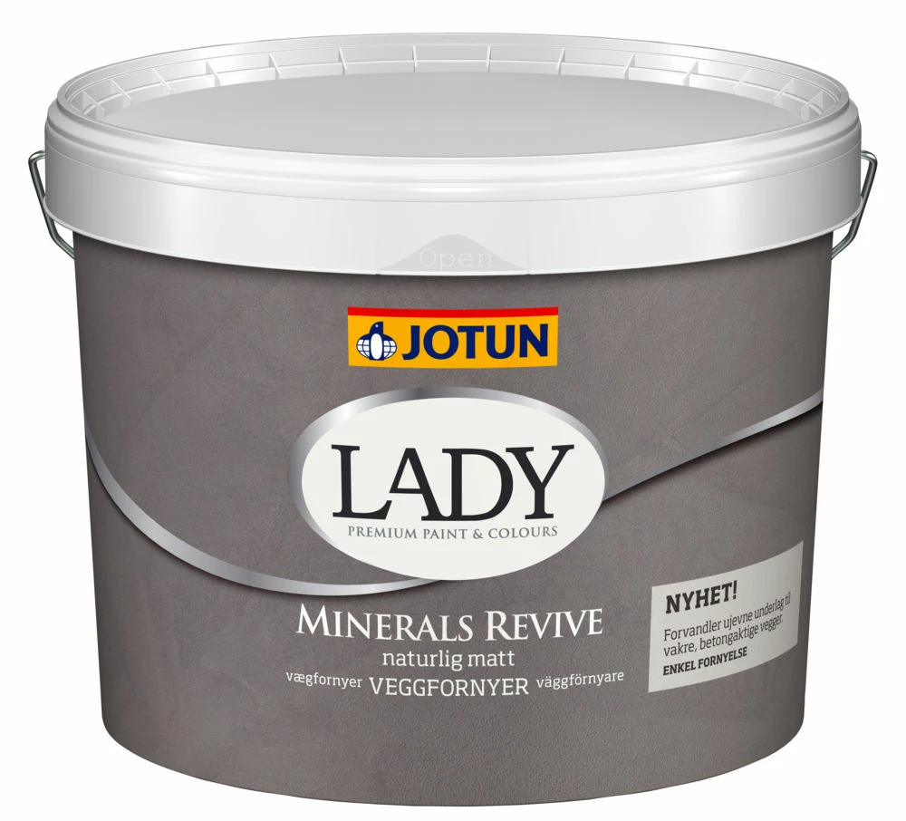 LADY Minerals Revive forvandler ujevne underlag – til vakre, betongaktige vegger. Med denne naturlige, mineralske veggfornyeren skapes en levende overflate med et unikt fargeuttrykk. Enkel og tidsriktig fornyelse av rom for en som virkelig trenger det. Matt veggfornyer til innendørs bruk i tørre rom. LADY Minerals Revive kommer i utvalgte LADY-farger. Beregn ca. 0,75 liter/m² per strøk.
