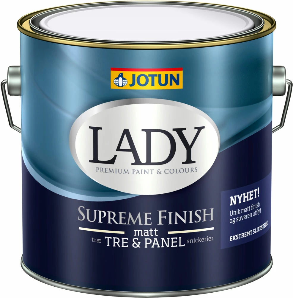 Jotun Lady Supreme Finish matt er en vanntynnet oljemaling for innendørs treverk. Brukes til mellom- og toppstrøk på panel, MDF, møbler, dører, karmer og listverk. Oljemalingen leveres i fire vakre glansgrader som kan blandes i alle farger. Velg fritt mellom matt, silkematt, halvblank og superblank. Lady Supreme Finish er godt egnet til å få forholdsvis lik glans og farge både på ferdigmalte vinduer, dører og listverk, slik at det blir enklere å få disse til å harmonisere med hverandre. Malingen har en suveren finish og en ekstrem slitestyrke, i tillegg til at den er vaskbar. Ubehandlet trepanel grunnes først med 2 strøk sperregrunn. Malingen er svanemerket og har EU blomst. Anbefalt forbruk pr. strøk: 8-10 m²/liter (glatte og ujevne underlag).