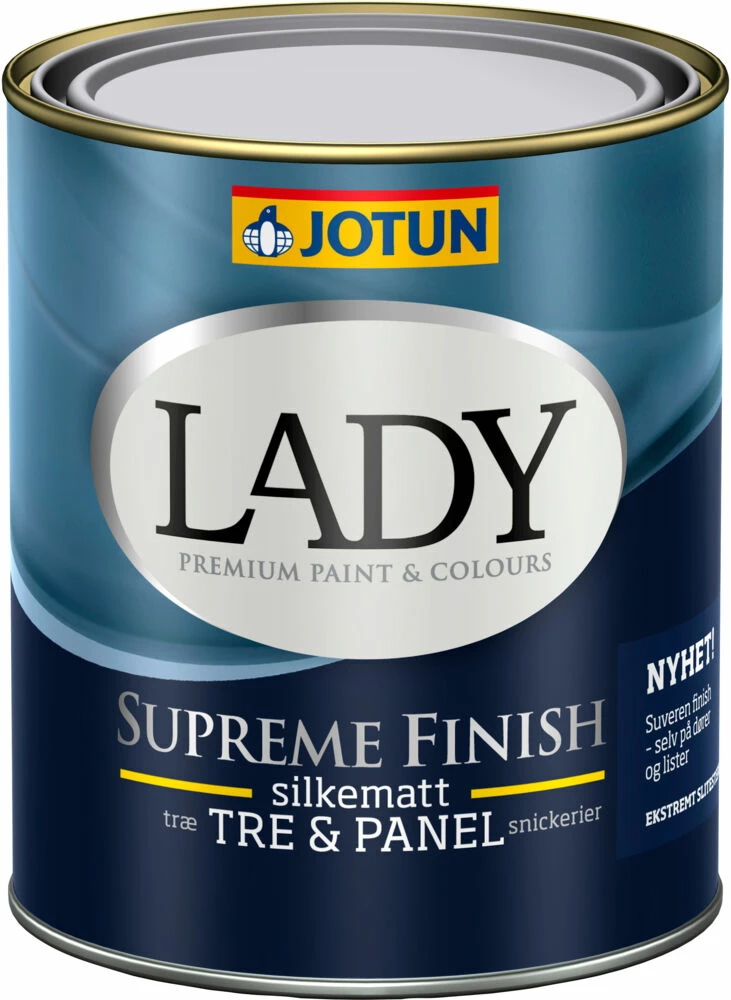 Jotun Lady Supreme Finish er en vanntynnet oljemaling for innendørs treverk. Brukes til mellom- og toppstrøk på panel, MDF, møbler, dører, karmer og listverk. Oljemalingen leveres i fire vakre glansgrader som kan blandes i alle farger. Velg fritt mellom matt, silkematt, halvblank og superblank. Lady Supreme Finish er godt egnet til å få forholdsvis lik glans og farge både på ferdigmalte vinduer, dører og listverk, slik at det blir enklere å få disse til å harmonisere med hverandre. Malingen har en suveren finish og en ekstrem slitestyrke, i tillegg til at den er vaskbar. Ubehandlet trepanel grunnes først med 2 strøk sperregrunn. Malingen er svanemerket og har EU blomst. Anbefalt forbruk pr. strøk: 8-10 m²/liter (glatte og ujevne underlag).