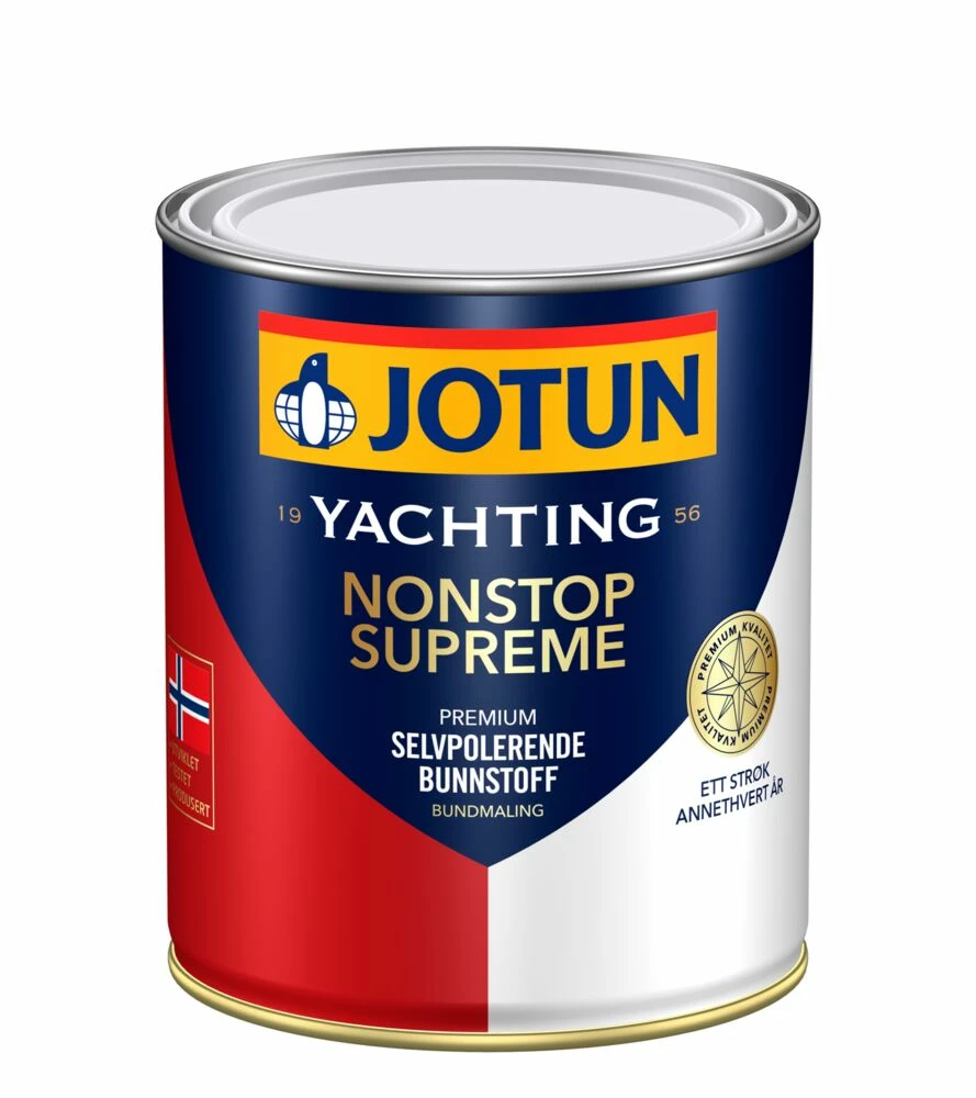 Jotun Nonstop Supreme er et høykvalitetsprodukt som gir en utmerket beskyttelse mot begroing. Det er basert på en unik bindemiddelkombinasjon som sikrer en aktiv overflate som kontinuerlig fornyes og gir et rent skrog gjennom to sesonger. Opptil 24 måneders vedlikeholdsintervaller. Anbefales ikke til båter som kun seiler i ferskvann, og ikke til aluminiumsskrog. Anbefalt forbruk pr. strøk: 5,2-13 m²/liter.