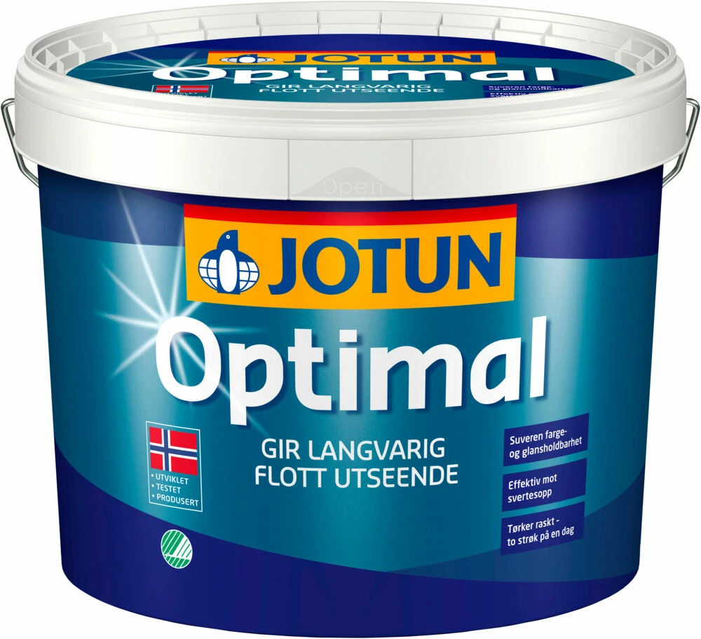 Jotun Optimal er suveren på utseende i år etter år. Optimal er tilpasset det norske klimaet og er tilsatt effektive midler mot svertesopp. Moderne teknologi gjør at farge og glans holder seg like flott i år etter år, samtidig som malingen tar opp minimalt med skitt. Maler du med Optimal er det lenge til neste gang du trenger å male – veldig lenge. Optimal er enkel å påføre og tørker raskt – to strøk på en dag. Ubehandlet tre må grunnes først. Ved tidligere malt/beiset tre må det vaskes med kraftvask først. Inneholder lysstabilisator. Svanemerket.