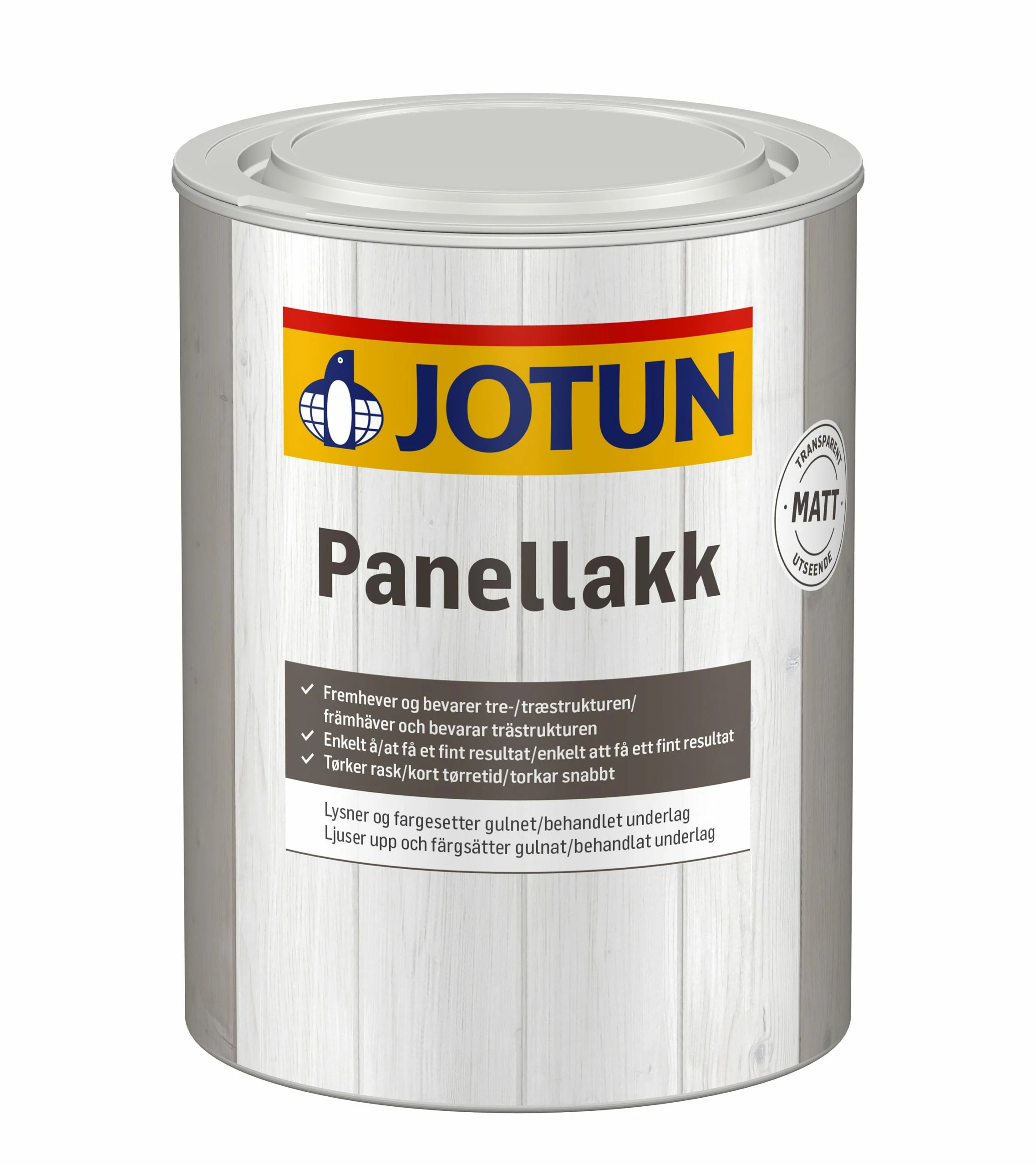 Jotun panellakk lysner og fargesetter gulnet/behandlet underlag. Fremhever og bevarer trestrukturen. Gir et tilnærmet transparent utseende. Inneholder lysfilter som effektivt reduserer gulning. Beskytter underlaget mot fett, vann og annet som kan gi skjemmende flekker. Luktsvak og tørker raskt. Spesielt egnet for tidligere behandlet panel, men kan også benyttes på ny panel. Anbefalt forbruk pr. strøk: 10-12 m²/liter (glatte underlag).
