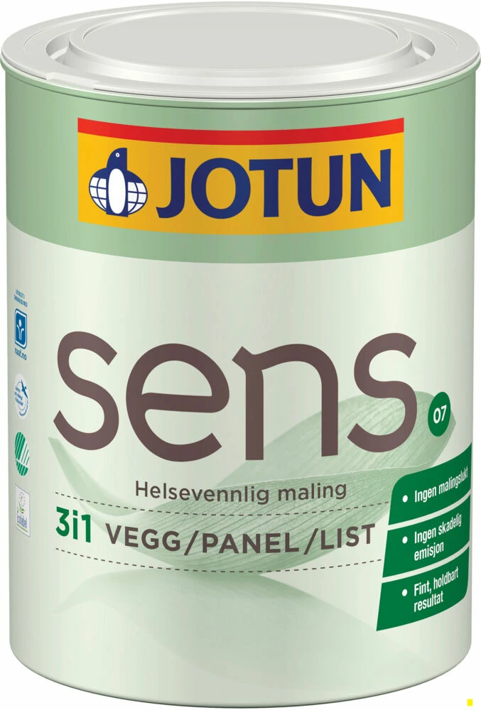 Jotun Sens vegg/panel/list 07 er en helsevennlig maling. Eneste malingsserie anbefalt av Norges Astma- og allergiforbund (NAAF). Ingen løsemidler. Ingen malingslukt. Ingen skadelig avdamping. Du er trygg fra første strøk. Helmatt. Tørker raskt og dekker godt. Kombinasjonsprodukt. Ubehandlet trepanel grunnes først med 2 strøk sperregrunn. Miljømerking: EU-blomst, Norges Astma- og Allergiforbund (NAAF). Anbefalt forbruk pr. strøk: 8-10 m²/liter (glatte og ujevne underlag).