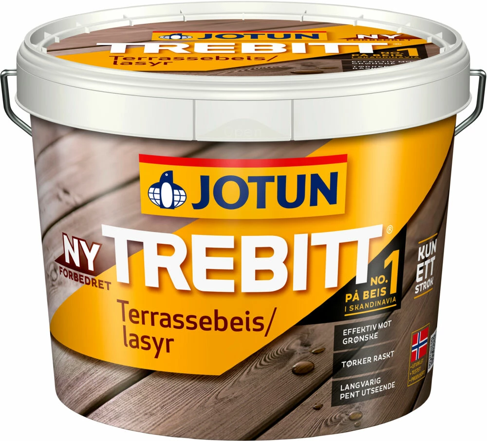 Jotun Trebitt terrassebeis er en vanntynnet oljebeis som fremhever og bevarer treverkets naturlige flotte utseende. Trebitt er en spesialbeis for impregnert treverk (terrasser, møbler og lignende) til utendørs bruk. Beskytter terrassen mot solens skadelige UV-stråler og fremhever og bevarer den naturlig trestrukturen. Terrassebeisen gir en vakker, matt og slitesterk overflate. Kun ett strøk er nødvendig. Regnsikker etter 1 time (avhengig av fuktighet og temperatur). Beskytter mot sprekkdannelser, lysnedbryting og fukt. Inneholder filmkonserverende middel mot svertesopp. Har gode penetrerende og vannavvisende egenskaper. Kommer i et stort fargeutvalg. Inntil 3 års vedlikeholdsintervall. Anbefalt forbruk pr. strøk: 6-10 m²/liter.