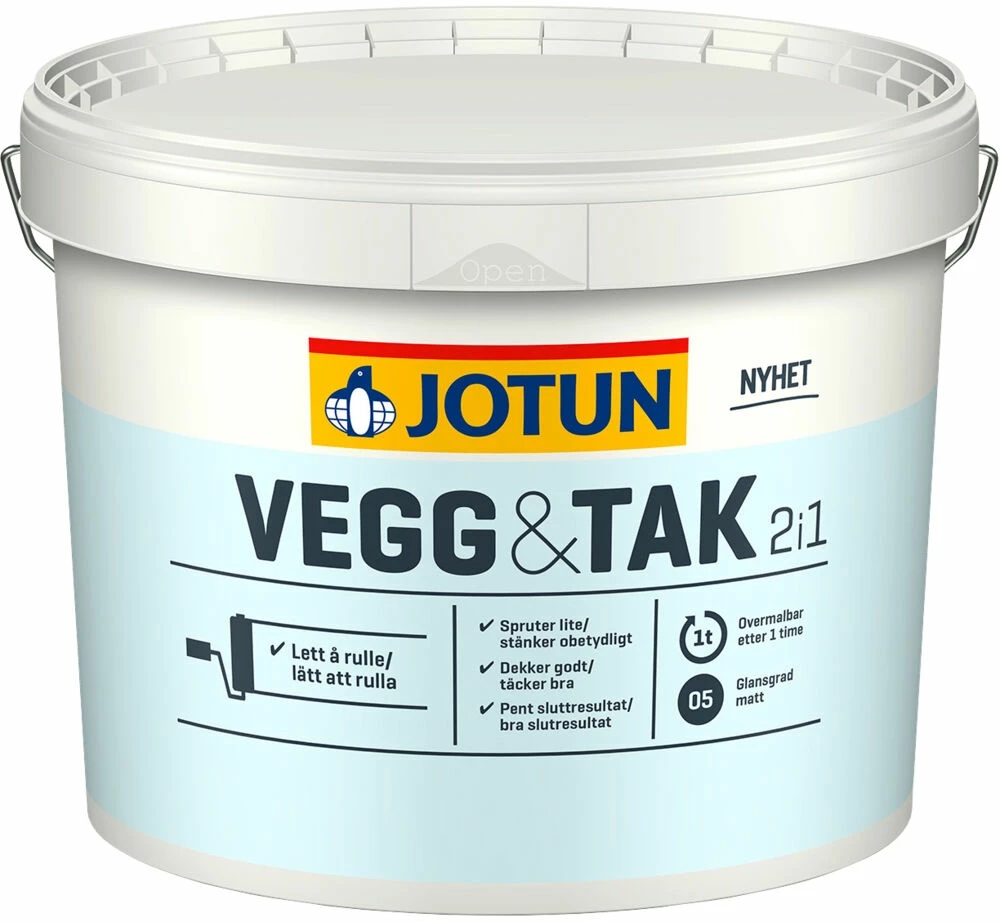 Jotun Vegg & Tak fungerer utmerket både på vegg og tak. Malingen er blank nok til vegg og matt nok til tak. Jotun Vegg & Tak dekker godt og er lett å påføre. Malingen spruter lite og tørker raskt. Overmalbar allerede etter 1 time. 3 liters spann. Anbefalt forbruk pr. strøk: 7-10 m²/liter (glatte og ujevne underlag).
