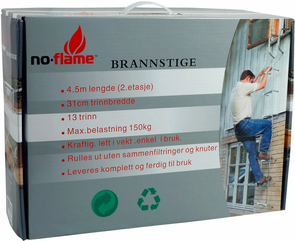 Brannstige 4,5 m lang (2 etg) med 13 trinn som hver har en bredde på 31 cm. Holder opptil 150 kg. Sterk, lettvekt og enkel å bruke. Rulles ut uten sammenfiltringer og knuter. Leveres komplett og montert.