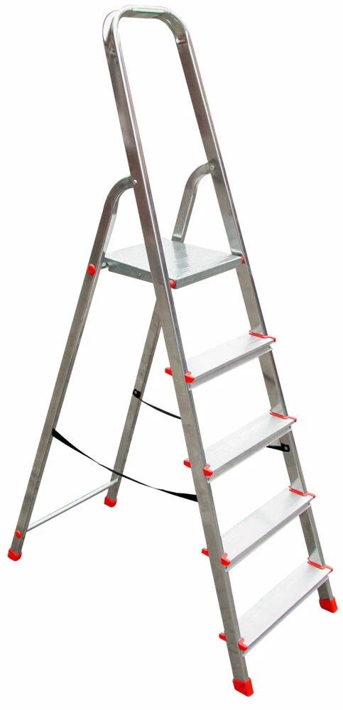 Nor-step gardintrapp 5-trinn er en stødig gardintrapp i aluminium med 5-trinn. Denne gardintrappen er lett å håndtere, har sklisikre trinn og har en god plattform å stå på. Den har en høy støttebue 61 cm over øverste trinn og er utrustet med en praktisk avlastningshylle. Plattformen i metall låser stigen i utfelt posisjon og sklisikre trinn gir god stabilitet. Gardintrappen passer bra for arbeid innendørs der det er viktig å benytte en lett og smidig trapp. Trinnflate bredde = 8 cm. Ståplade øverst (BxL): 26 x 26 cm. Avstand mellom trinn = 18 cm. Maksimal bredde = 90 cm utfoldet. Minimal bredde = 11,5 cm sammenlagt. Godstykkelse = 0,2 mm. Maksimal belastning: 150 kg.