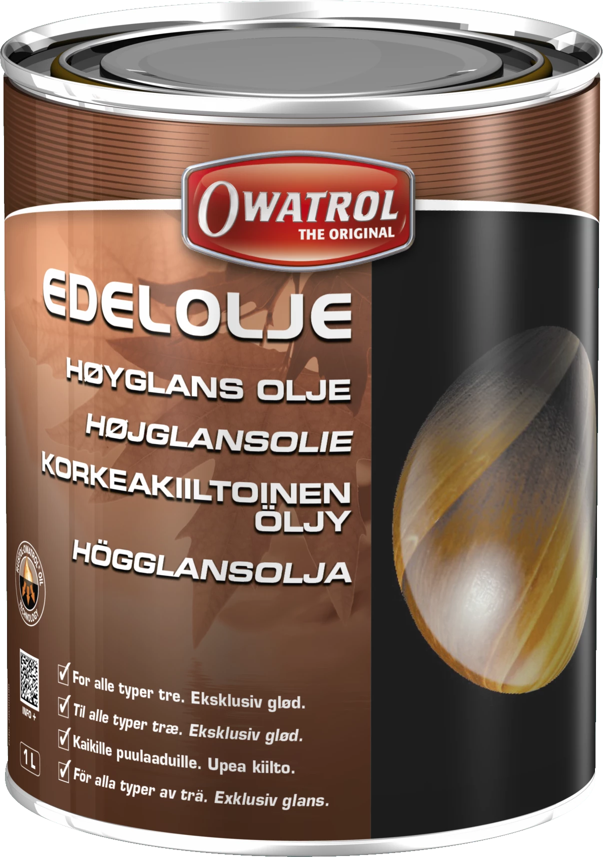 Owatrol edelolje gir en høyglans overflate og beskytter alle typer tresorter. Overflaten kan minne om lakk, men den flasser ikke. Owatrol edelolje tåler høy slitasje. Anbefalt forbruk pr. strøk: 8-10 m²/liter.
