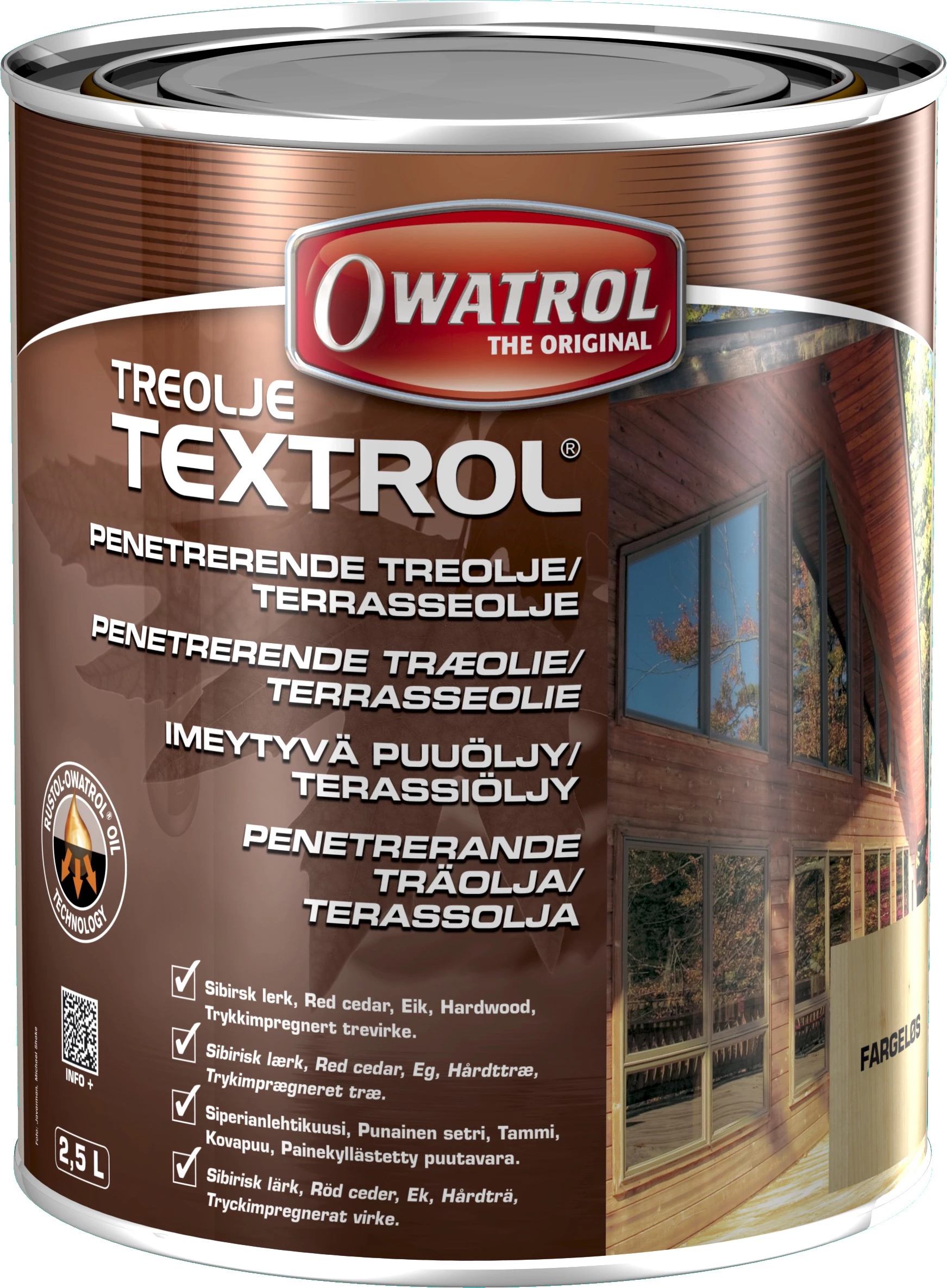 Textrol er en peneterende treolje beregnet på å gjenopplive værslitt og tørt treverk utendørs. Anbefalt forbruk pr. strøk: 5 m²/liter.