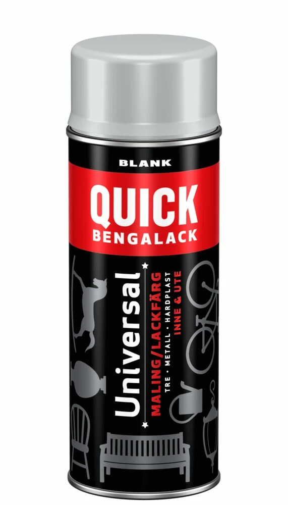 Quick Bengalack Universal blank spray er utviklet til å gi en sterk og slitesterk overflate til underlag av metall, tre og hardplast – inne som ute. Sprayen kommer i mange flott farger og er ideell når “vanskelige” gjenstander med mange krinker og kroker skal fornyes. Sprayen gir en flott, hard og blank overflate som tørker på 1 time. Raskt og enkelt. 400 ML.