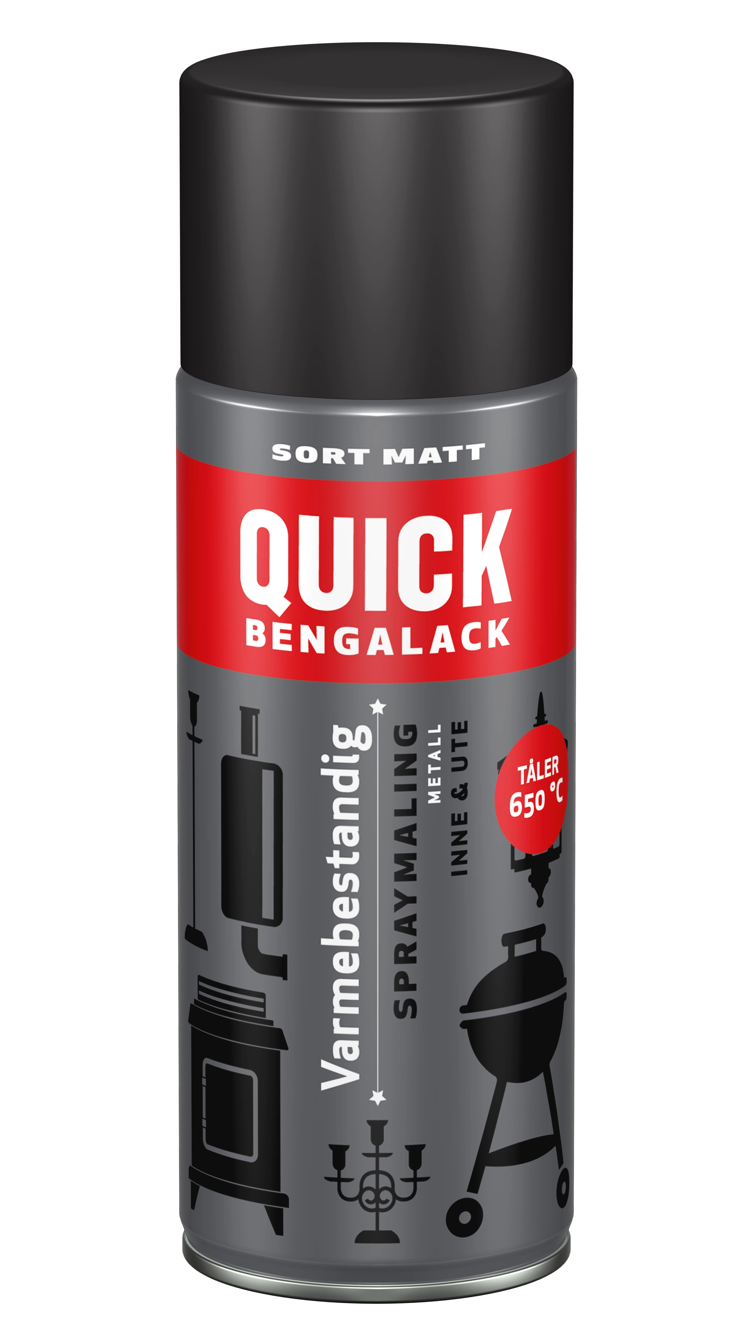 Quick Bengalack Varmebestandig spray er en sort matt spraymaling som tåler hele 650° C. Utmerket til griller, eksosanlegg, gressklippere, ovner, peiser mm. Den er svært fargebestandig og holder seg godt over lang tid. 400 ML.