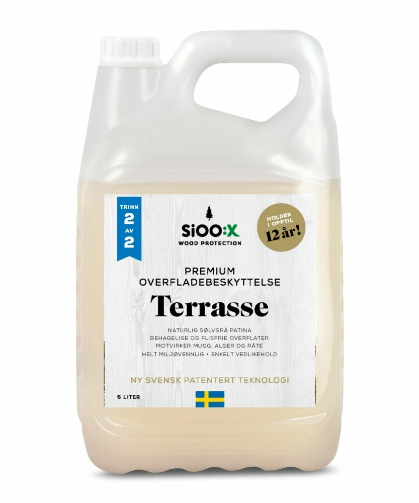 SiOO:X trebeskyttelsessystem for terrasser består av en trebeskyttende grunnbehandling og en kompletterende overflatebehandling. Sammen trenger de inn og forenes ekstra godt med treet, noe som gir lang holdbarhet og naturlig sølvgrå treoverflater.