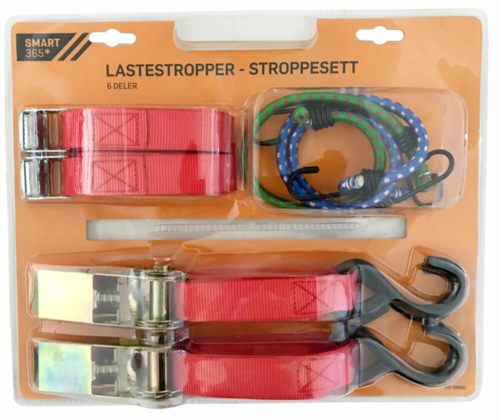Smart 365* lastestropp/bånd/strikk er en pakke med diverse lastesikringer. 2 x lastestropper, 2 x lastebånd og 2 x lastestrikk.