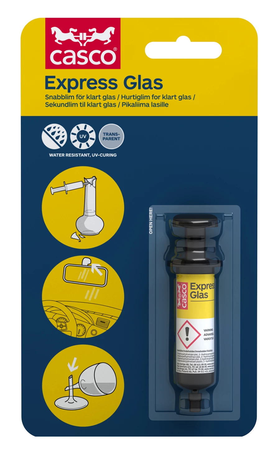 Casco Expressglass 2 ml er et spesiallim for liming av glass. Limfugen er vannbestandig og fargeløs. Limet herder ved hjelp av sollysets UV-stråler.