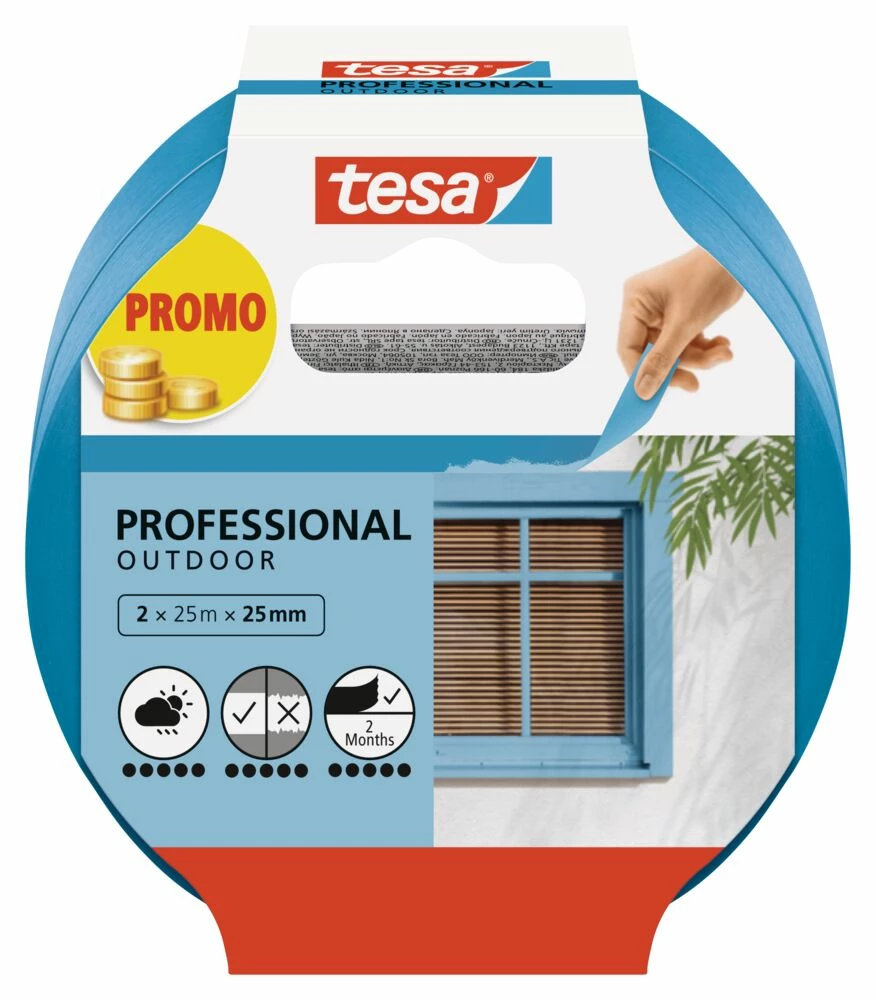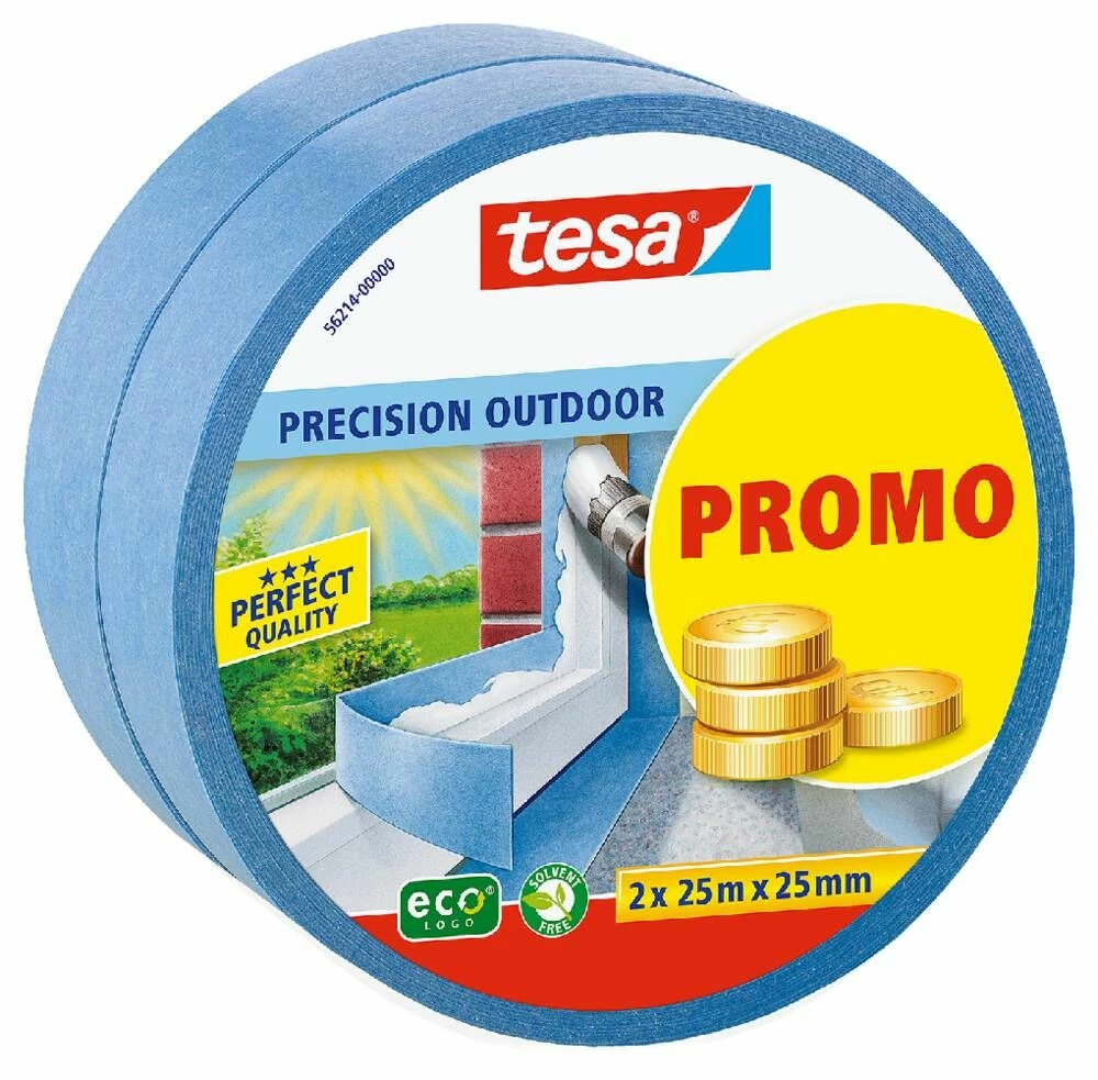 tesa® Precision outdoor maskeringstape er ekstra tynne, blå maskeringstape for høykvalitets malingsjobber med presist definerte malingskanter. Den skiller seg ut for den pålitelige vedheften, og garanterer restefri fjerning selv etter 8 uker. I tillegg er det en maskeringstape som er både værmotstandig og UV-bestandig for alle typer utendørs oppussingsarbeid.