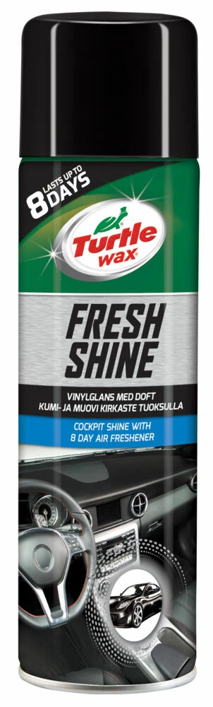 Turtle Wax Fresh Shine interiørspray som etterlater en langvarig duft. Sprayen beskytter og frisker opp alle interiørdetaljer av plast, gummi og vinyl til “ny bil”-utseende. Samtidig frigjøres langsomt en lett, forfriskende duft, som vil vare i opptil 8 dager. Fresh Shine etterlater en anti statisk silikon hinne, som frastøter støv og smuss for en langvarig glanset overflate. Må ikke brukes på glass, lakk, stoff, gulv, instrumenter, eller områder hvor glatte overflater ikke er ønskelig. 500 ML.