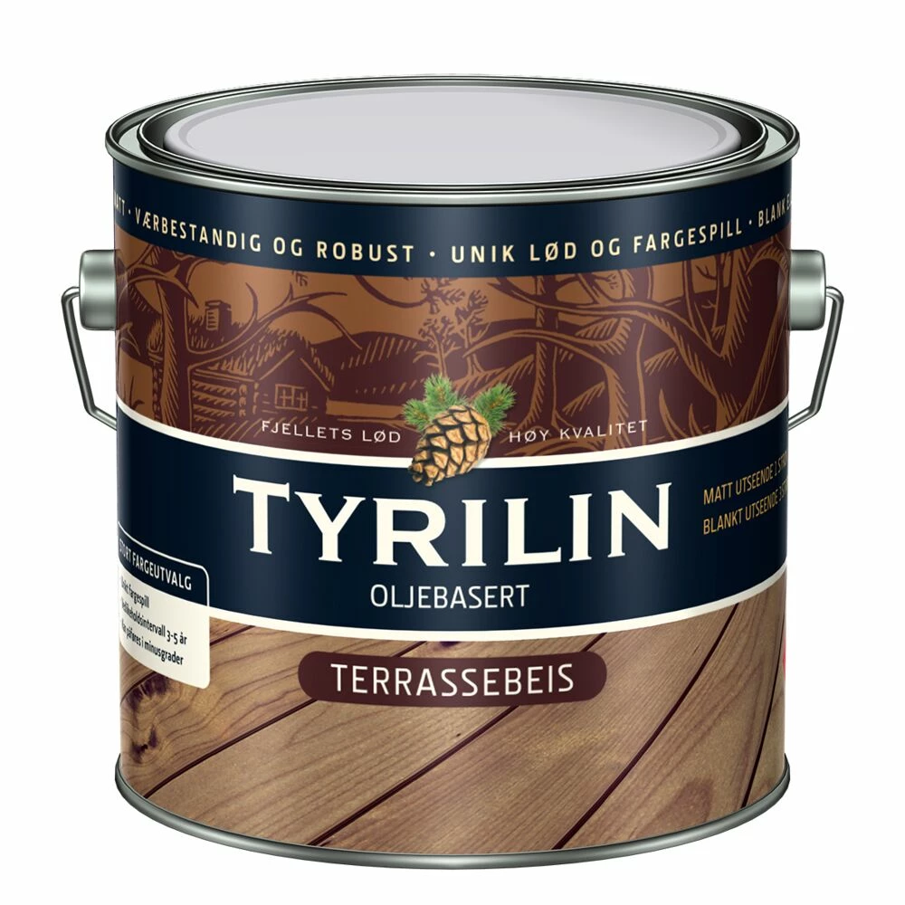 TYRILIN Terrassebeis er spesialutviklet for å gi vakkert transparent utseende og tåle tøft klima. Terrassebeisen er forsterket med UV-filter og transparente pigmenter av høy kvalitet for god værbestandighet og vakkert fargespill. Beisen har svært god inntrengningsevne og gir en god vannavvisende overflate. Kan påføres i minusgrader. Tyrilin Terrassebeis kan blandes i mange vakre farger. Velg mellom matt og transparent utseende eller et blankt og mer fargesterkt utseende.