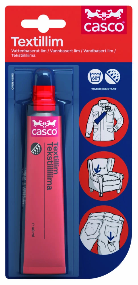 Casco textillim 40 ml er et vannbestandig lim med mange bruksområder. Det kan brukes til å lime grove tekstiler i skinn, bomull, ull, lin, polyester, acryl og ull i for eksempel presenninger, telt, seil, arbeidsklær og mye mer.